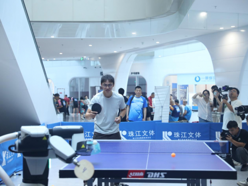 科技元素为本次小球赛事注入活力。场馆入口处,人形机器人宇树G1正向入场观众点头致意,与选手热情握手;另一边,头戴狮头装饰的宇树机器狗GO2方阵表演憨态可掬的舞蹈,引得小朋友们目不转睛,银发选手们也纷纷驻足拍照。西侧训练区,国内顶尖的乒乓球机器人庞伯特M-one提供多难度训练模式,选手和观众可以尽情体验不同强度的发球练习。这些设备不仅提升了运动体验,也让体育赛事成为科技与人文融合的舞台,展现了科技赋能体育的无限可能。