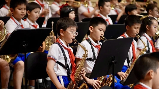 本次音乐会紧扣“童心向党 强国有我”的主题,管乐团深入挖掘红色文化内涵,精心打磨《唱支山歌给党听》《红星歌》等经典作品。当《唱支山歌给党听》的旋律响起,西洋管乐与五千年中华文明的厚重节拍悄然融合,实现了一次跨越时空的精神对话,让党的光辉与少年的担当,成为照亮孩子们成长之路的璀璨星光。
