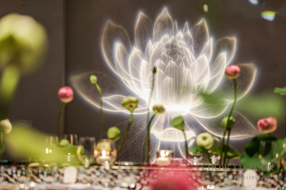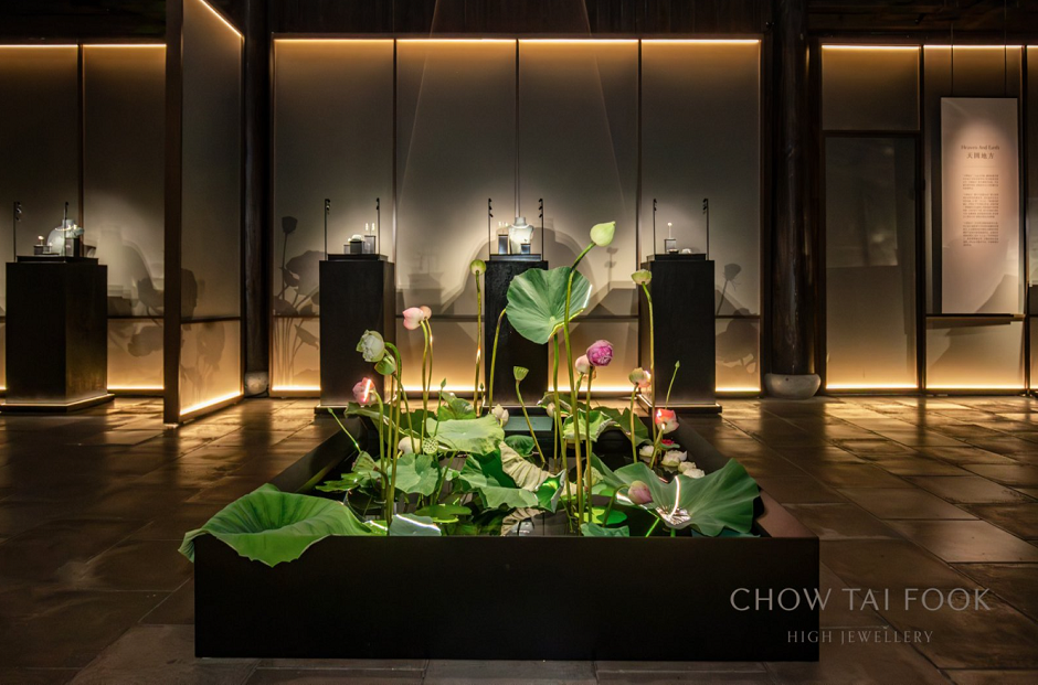 步入典雅古韵的高级珠宝作品展厅,素墙光影流转,如走入诗画长卷。展厅中央,一方清池悄然铺展,数株莲花依水而植。“莲华清韵”作品陈列四周,以灵动线条复现池中莲花的雅韵,珠宝经精湛工艺雕琢流转出莲叶承露的璀璨。