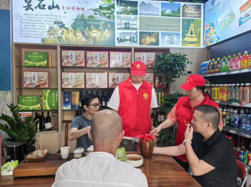 图为闽侯烟草志愿者与青红酒非遗传人共同探讨特色经营模式。冯榆彬供图