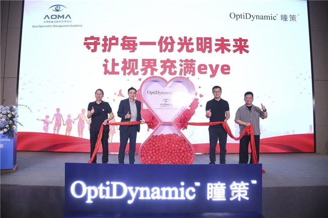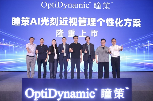 紧接着全场迎来首个高潮——新品发布启动仪式。宣告OptiDynamic ™瞳策™AI光刻近视管理个性化方案正式扬帆起航!