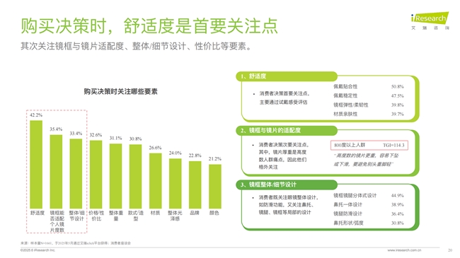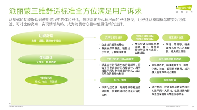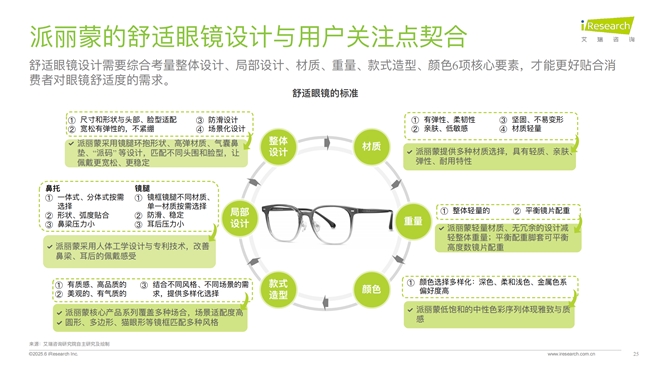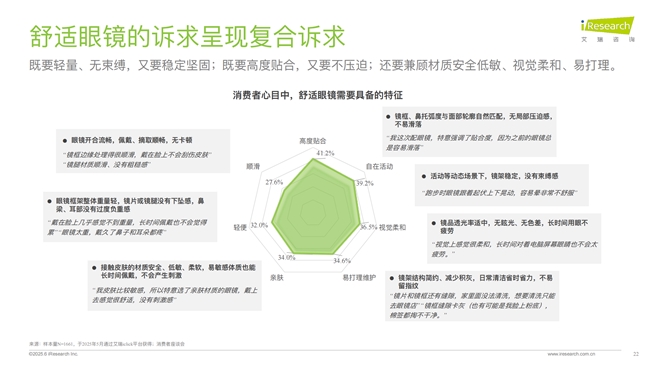 艾瑞白皮书中指出,消费者对舒适眼镜呈现复合性诉求,既要轻量、无束缚,又要稳定坚固;既要高度贴合,又要不压迫;还要兼顾材质安全低敏、视觉柔和、易打理。