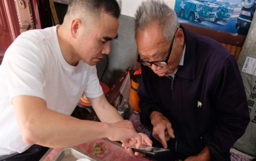 图为在温显辉家中,烟草工作人员(左)指导温显辉(右)手机订货。巫桂琴供图