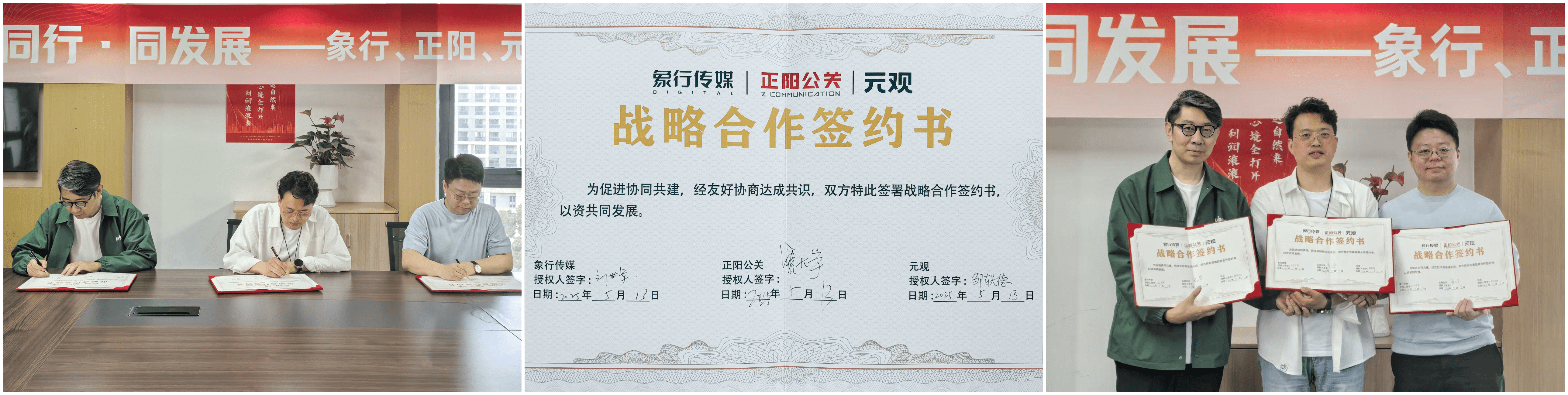近日,国内知名品牌服务领域的三家企业——正阳公关(定位落地与事件营销)、象行传媒(全场景广告营销)与元观品牌咨询(品牌视觉设计)在南京正式签署战略合作协议。三方联合宣布将围绕客户品牌服务共建“一体化全链路服务体系”,以整合优势资源为品牌提供从“定位落地-视觉升级-营销转化-用户运营”的全周期解决方案。此次合作不仅为企业构建更具竞争力的品牌价值与市场影响力创造了全新可能,也标志着品牌服务行业向协同化、专业化迈出了坚实一步。