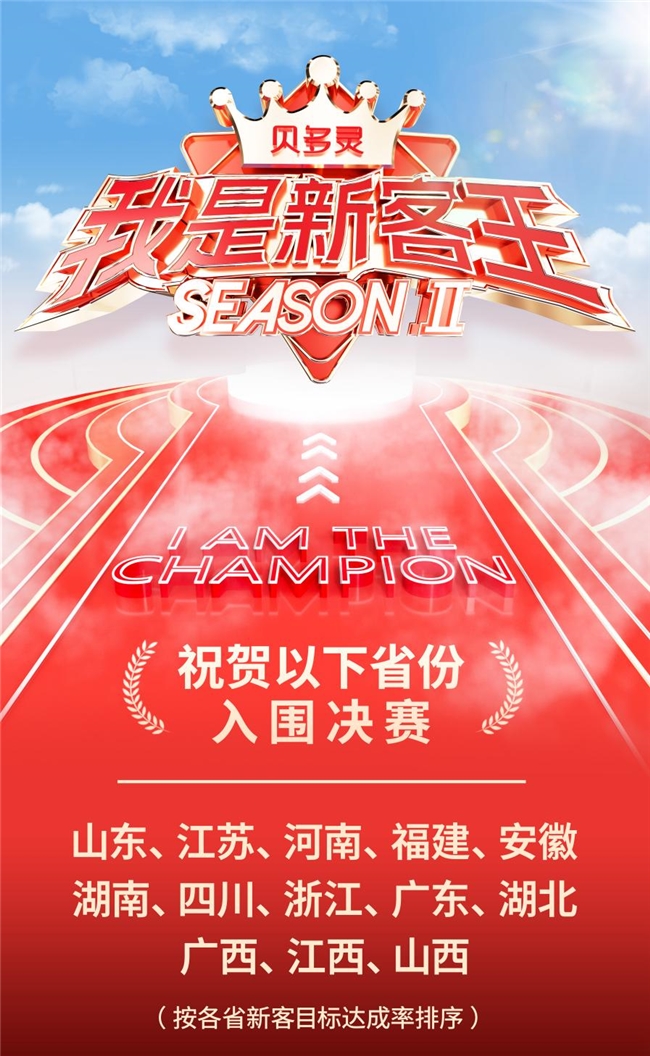按照本届贝多灵新客王的赛制规则,达成省级挑战目标的省份,其所有门店方可获得宝贵的全国决赛入场券;未达标省份,则全部门店遗憾止步。最终,经过严格的数据核定,全国仅有山东、江苏、福建、河南、安徽、湖南、四川、浙江、广东、湖北、广西、江西、山西13个省份成功达成挑战目标并获得挑战奖励,其所有门店将代表本省进军全国总决赛,这也是对入围省份团队作战能力的最高认可。