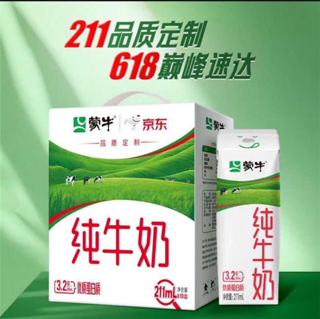 今年618期间,京东超市联合蒙牛推出独家定制的211毫升规格的系列产品。相较其他平台上,10盒装的200毫升规格的纯牛奶均价21.6元,京东超市独家定制版10盒装的211毫升规格的仅售19.9元。