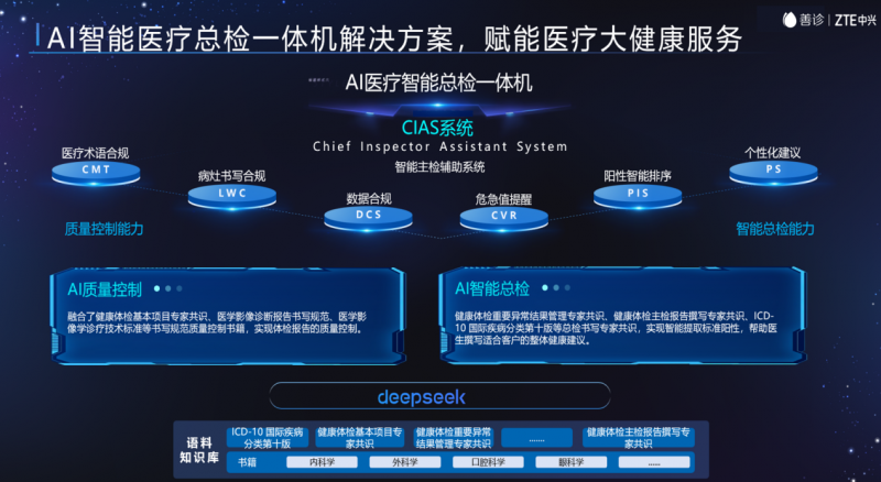 而善诊与中兴研发的AI智能总检一体机直面痛点,基于DeepSeek大模型开发,可以自动完成报告质量控制、阳性体征提取及总检报告撰写工作,包含异常信息的精确筛选与个性化医学建议生成,从而让医生专注于核心医疗决策以及与患者的有效沟通。