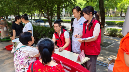 活动中,志愿者帮助医护人员有序的为居民开展测血压、测血糖等一系列体格检查,并发放健康宣传资料。