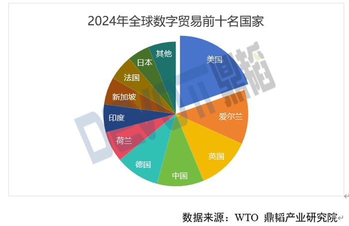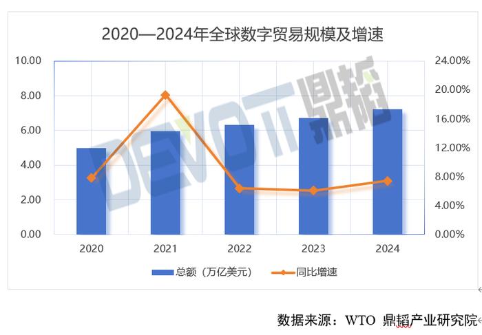 根据鼎韬发布的最新数据,2024年全球数字贸易规模达到7.22万亿美元,展现出强劲活力。与2020年的4.99万亿美元相比,四年间增长了44.74%,年度复合增长率(CAGR)达9.69%。2024年,全球数字贸易规模同比增长7.45%,高于全球商品和服务出口整体增速(4.43%)3.02个百分点,占全球商品和服务出口总额的比重也提升至21.73%。