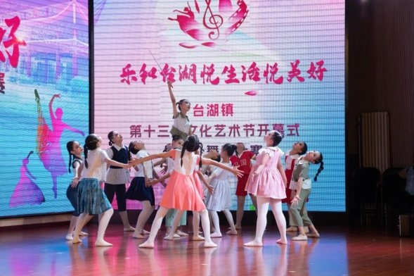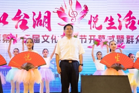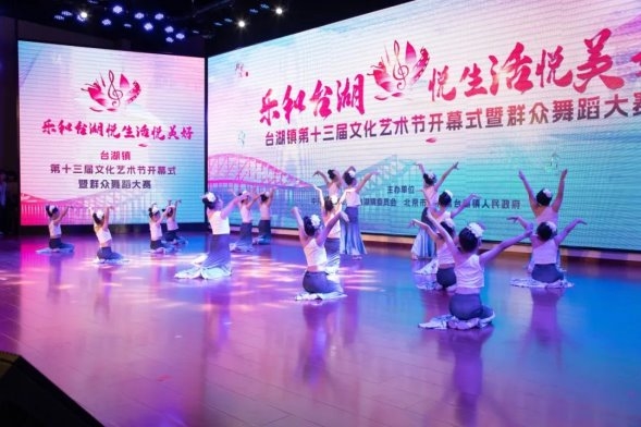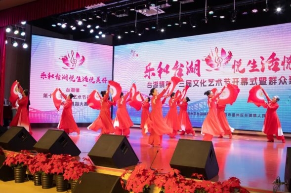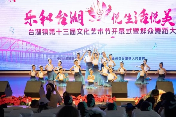 台湖镇党委书记王鑫宣布艺术节正式开幕。随着激昂的音乐,表演学生徐徐展开书写着“乐和台湖 悦生活悦美好”的折扇,瞬间点燃现场气氛,将开幕式推向高潮。