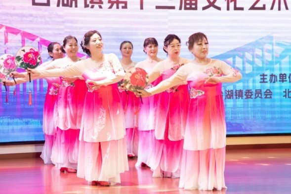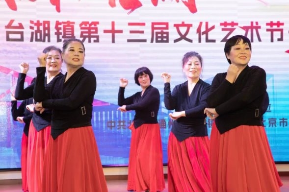 台湖镇稻田和风舞蹈队演绎的《清风徐来》,巧妙融合中国传统文化底蕴与现代舞蹈语言,舞姿翩跹间,仿佛让人置身于绿树成荫、清风拂面的台湖生态画卷之中,传递出居民内心的宁静与和谐。