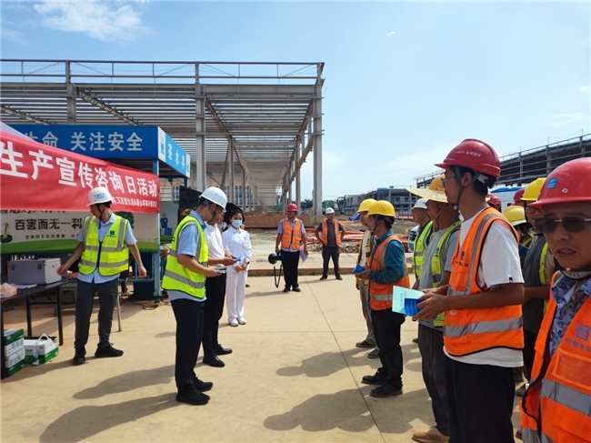 6·16安全宣传咨询日--项目部邀请京东方老师开展面向一线工人的安全宣传咨询活动:集中组织观看安全月主题宣传片;发放安全月知识宣传手册和项目安全生产举报与奖励制度手册;以《安全生产法》为出发点讲解从业人员的权利和义务。