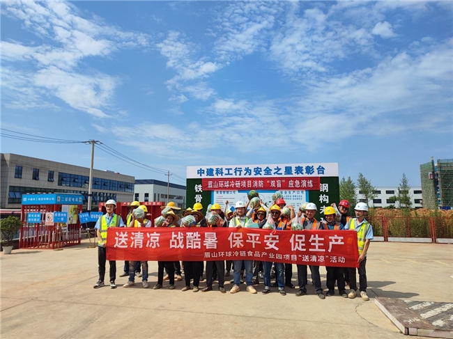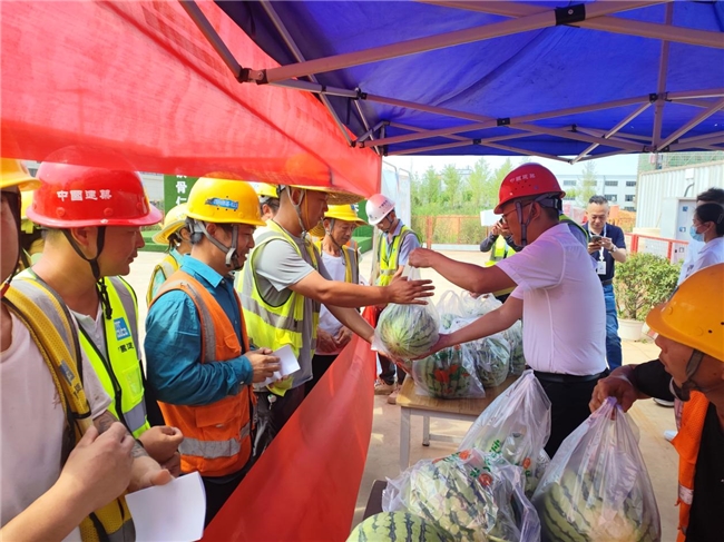【情系一线送清凉】--为保障在高温酷暑环境下施工人员的身体健康,项目部开展为一线工人送清凉的活动,现场发放西瓜、藿香正气液等防暑降温物资,并讲解各类防暑降温知识,要求各单位落实极端天气管控措施,以此保障全体工人的健康安全。