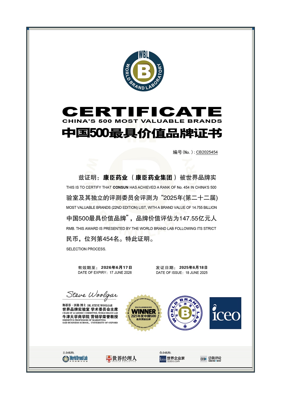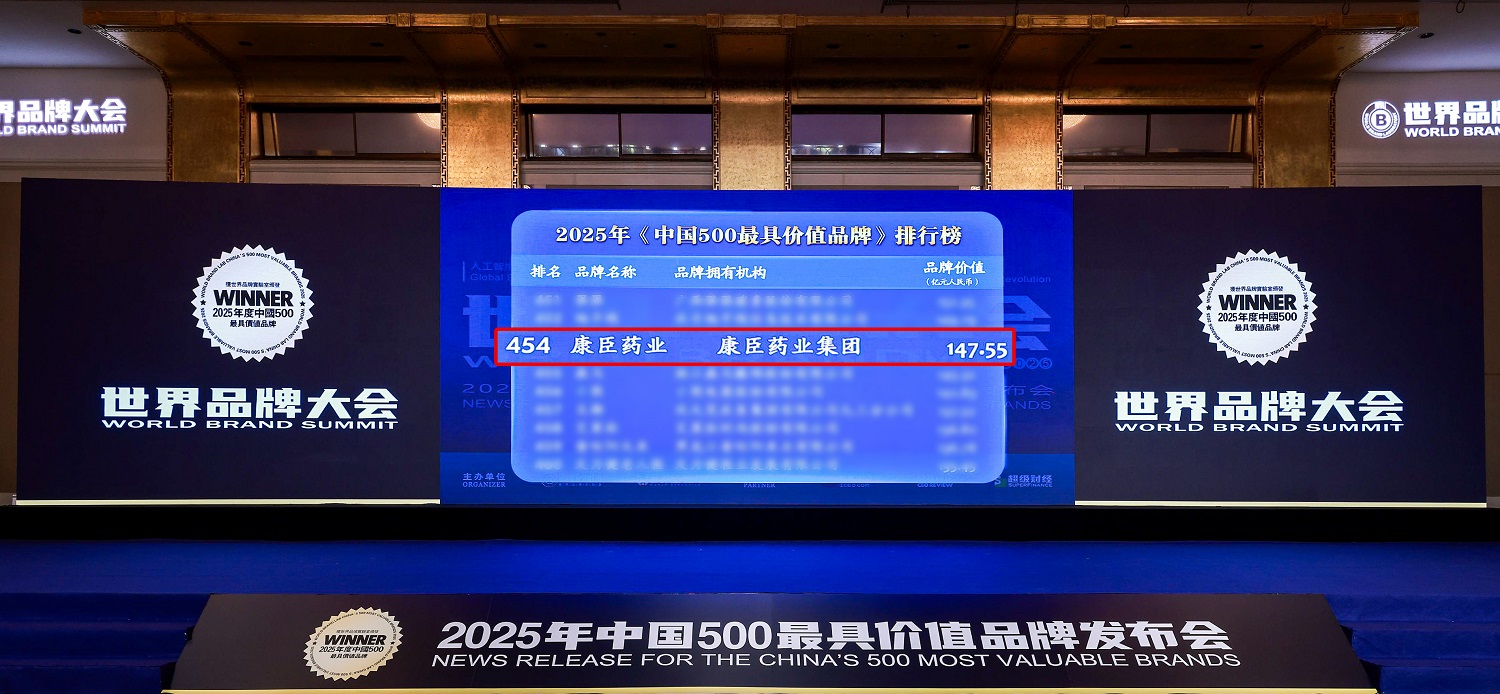 6月18日,世界品牌实验室(World Brand Lab)主办的(第22届)“世界品牌大会”在北京隆重举行。会上发布了《中国500最具价值品牌》榜单,康臣药业以 147.55 亿元品牌价值位列第 454 位,较2023 年的112.36亿元增长约 30%,名次上升8位。彰显出中国品牌在现代市场环境中的强劲生命力与创新韧性。