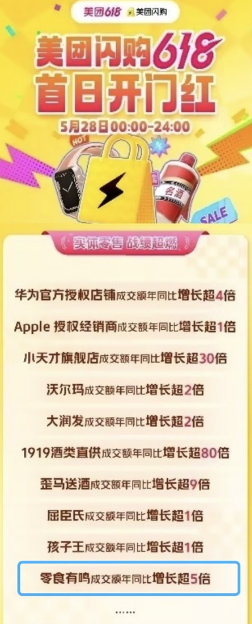 除了抖音直播与团购为门店引流到店之外,“零食有鸣批发超市”还借力美团闪购渠道,帮助门店大大拓宽了生意半径和客户群体。据《证券日报》报道,今年“6.18”,“美团闪购对品牌和商户真金白银坚定投入,带动多个零售品牌和连锁零售门店成交额、增速创新高”,其中“零食有鸣成交额同比增长5倍”,实实在在地帮助门店生意实现了大幅提升。