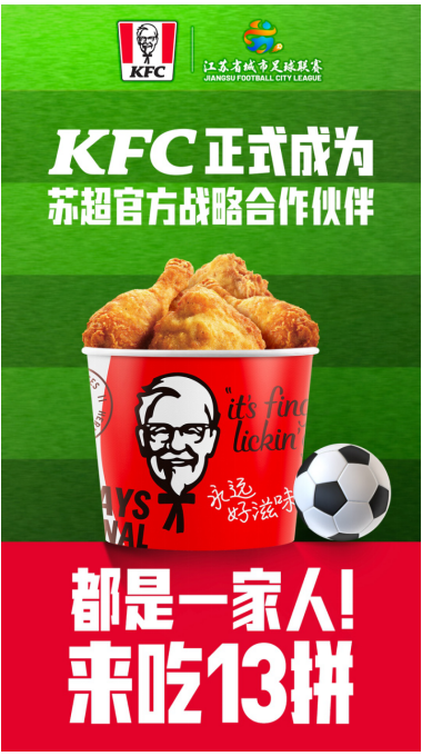 6月20日,肯德基与江苏省体育产业集团有限公司正式签署战略合作协议,成为本届“苏超”联赛官方战略合作伙伴,同时也是唯一与主办方达成战略合作的西式快餐品牌。