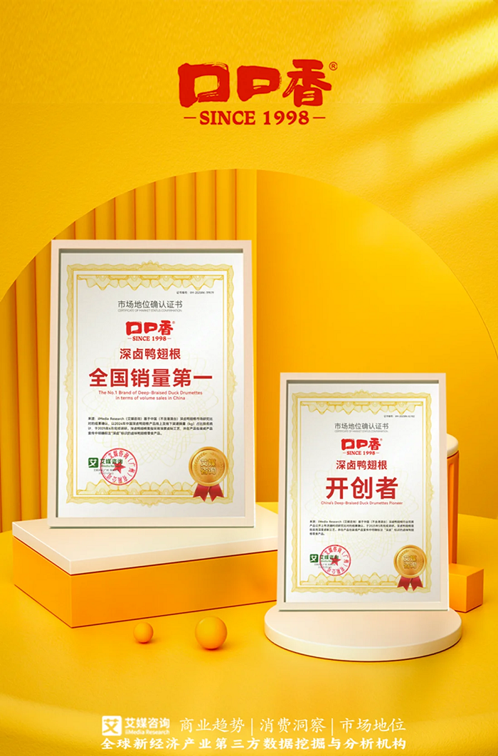 近日,口口香获全球领先的新经济产业第三方数据挖掘和分析机构iiMedia Reearch(艾媒咨询)授予的“深卤鸭翅根开创者”及“深卤鸭翅根全国销量第一”双项市场地位确认。