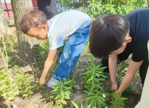 来到小菜园后,孩子们迫不及待地行动起来,化身“劳动小能手”。他们蹲下身子,小手紧紧抓住杂草的根部,用力一拔,一株株杂草被连根拔起。有的孩子力气小,遇到顽固的杂草时,同伴们立刻伸出援手,大家齐心协力,互帮互助,场面温馨又有趣。“老师,你看我拔了好多!”“我们这一组的杂草最多!”孩子们一边劳动,一边兴奋地