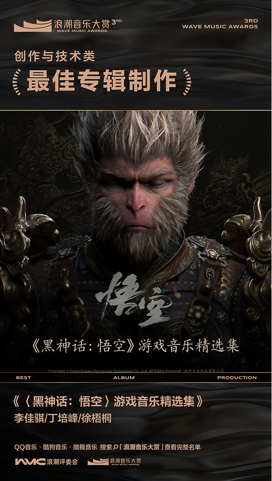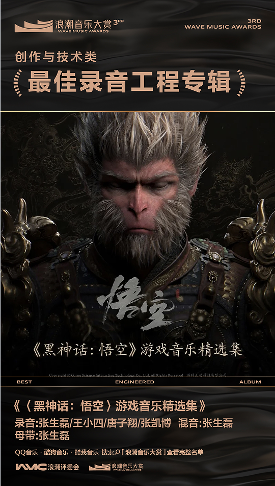 此外,《黑神话:悟空》游戏音乐精选集,作为游戏的衍生音乐作品,凭借其精良的录音品质与制作水准,同时获得了最佳录音工程专辑与最佳专辑制作两项创作与技术类荣誉。