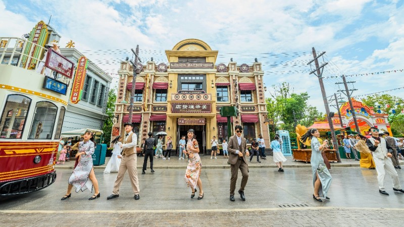 “香港街”浓郁的港式风情给“西游团”成员们留下了深刻的印象,闪烁的霓虹灯牌、老旧的街头布景,仿佛瞬间被带入到港片中的黄金年代,引发现场众人的强烈共鸣。而“上海街”也是本期节目录制的主要场景之一,这里不仅复原了民国时期大上海的繁华盛景,还通过丰富多彩的演艺互动活动,让游客沉浸式体验到跨越时空的民国风情。节目中,“西游团”成员们身着摩登复古服装,乘坐园区特色叮叮车和老爷车穿越主题街区,不仅品尝到街头风味美食,还随着怀旧音乐一起劲舞蹦迪,欢乐互动,嗨玩不停。在模仿、问答和游戏环节,当成员熟练地说出熊大、熊二、光头强经典语录,《西游记》和《熊出没》两大观众熟悉的经典IP,以意想不到的方式实现破次元壁联动,碰撞出奇妙的火花。