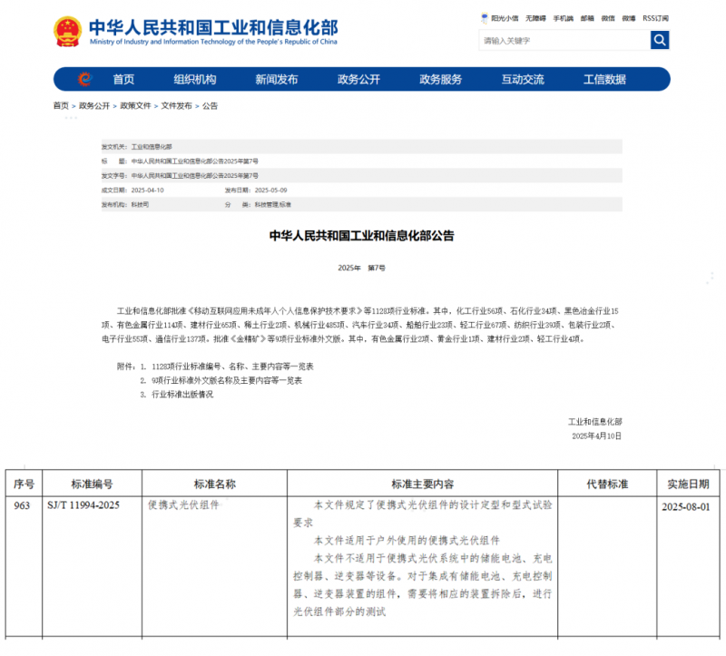 近期,工业和信息化部发布了2025年第7号公告,批准《便携式光伏组件》(SJ/T 11994-2025)等1128项行业标准。作为便携储能全球领导者和全场景家庭绿电开创者,华宝新能(股票代码:301327)牵头制定的《便携式光伏组件》行业标准,首次针对户外便携式光伏组件的设计定型与型式试验提出系统性技术要求,填补了国内细分领域标准化空白。该项标准将于2025年8月1日正式实施,这也标志着我国便携光伏产业将正式进入“标准化发展”新阶段。