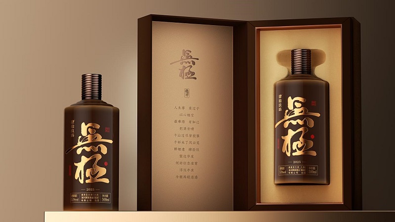 无极酒采用“藏而不露,简而不凡”的设计理念,器形为景德镇传统名瓷,经典平肩、鎏金烤花,搭配潇洒飘逸的书法大字“无极”,瓶盖形似“无穷符号∞”,寓意酱香生命力的永续流转,整体造型简约而不失高贵。