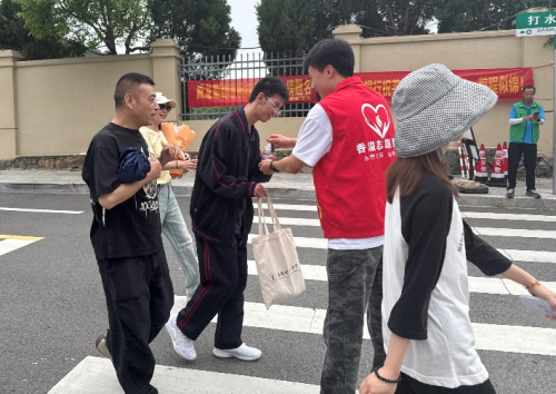 图为“香溢”志愿者向考生免费送水。邱颖莹/摄