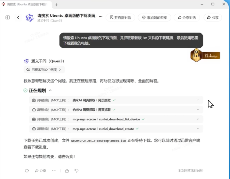 (纳米配置迅雷 MCP 服务后进行指令执行)