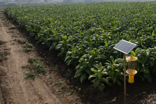 除了“以虫治虫”的生物防治,另一片烟田的杀虫灯和黄板也是生态防控的新屏障。夜幕降临时,田间的杀虫灯亮起,吸引飞蛾扑火;黄板则像“粘虫贴”,密密麻麻粘住蚜虫。烟农汪大姐正忙着检查这些设备,“这灯一开,晚上害虫少多了,黄板更简单,挂上去就不管了。”她掰着指头算账,“有了这些小工具,虫害防治便捷多了,还省了不少农药钱呢!”