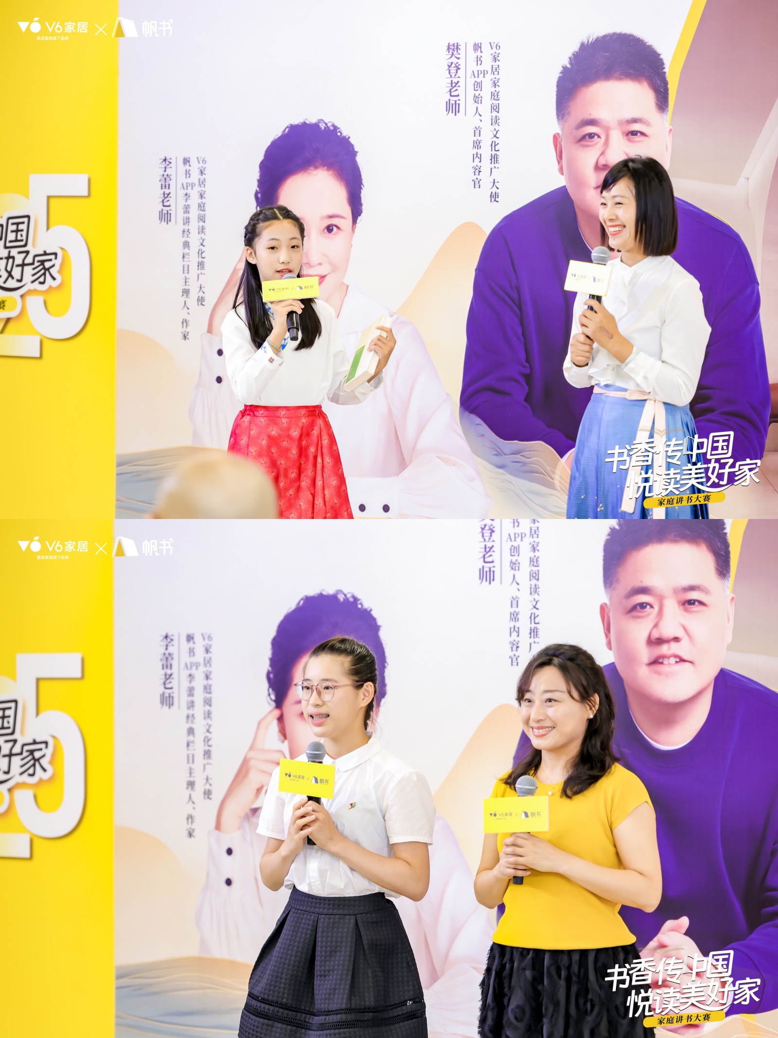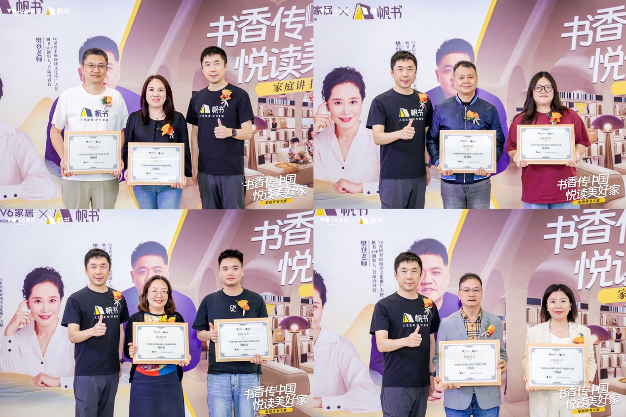在慕思事业部总经理刘院之、 V6 家居事业部总经理江涛、帆书APP创始人兼首席内容官樊登、帆书APP CEO吴江、帆书APP副总裁安贞灿共同登台见证下,“书香传中国 悦读美好家”家庭讲书大赛正式宣告启动。紧接着,上海、郑州、杭州、南京四大晋级赛城市授牌仪式启动,帆书APP CEO吴江分别为V6家居四城代理商和帆书四城运营中心负责人授牌。活动期间,还有两组家庭登台现场演绎了家庭共读故事,生动展现了大赛的参与形式与文化价值。