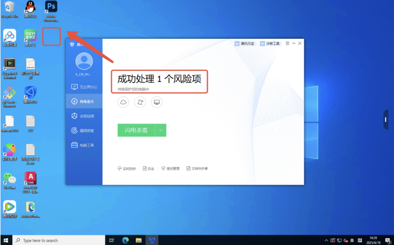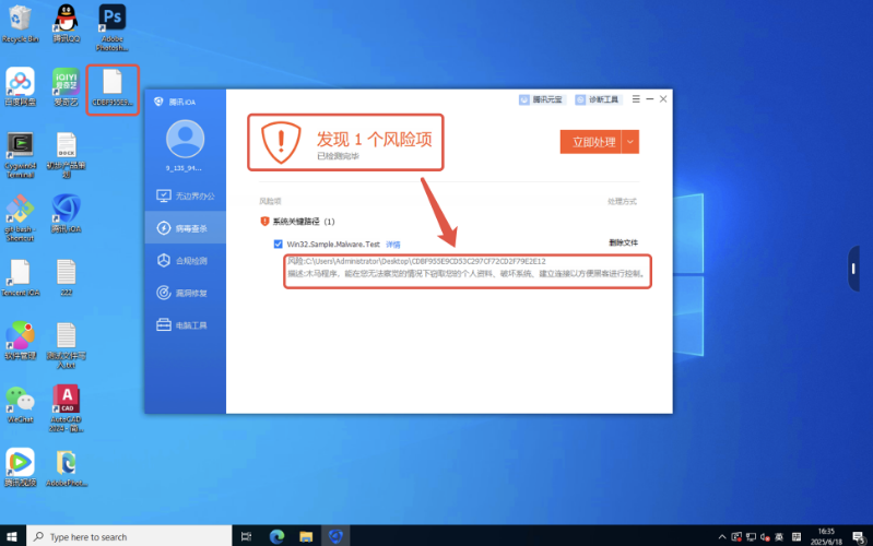 ● 一键处理,自动化清除病毒:在客户端点击“立即处理”后,终端自动执行清除动作并反馈“成功处理风险项”,可以看到桌面的病毒文件同步删除,效率大幅提升。