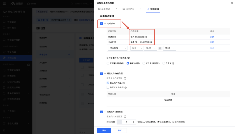 ● 自定义定时杀毒,高效运维不打扰:免费提供定时杀毒功能,可设置午休、周五下班等非工作时段自动扫描,配合定时关机功能,全程无需人工干预,既避免打扰员工办公,又能让IT运维人员通过控制台批量设置任务,大幅提升管理效率。