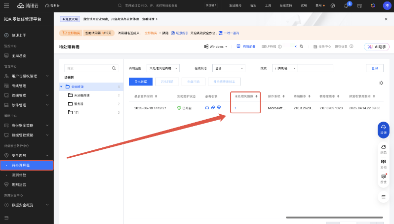 ● 控制台集中管控,风险精准定位:不仅终端会提示,在iOA控制台“待处理病毒”模块也能看到“未处理风险数”新增记录,结合终端信息,精准定位风险设备。