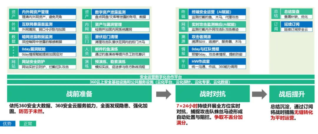 ● 战时:建立“云端”作战室,便于统一沟通,提升作战效率,同时能够高效调用360平台级安全能力,实时处置安全威胁;云端专家及360AI数字员工防守军团7*24小时权威执守,不间断开展全方位实时对抗,捕捉攻击队蛛丝马迹,形成自动处置与拦截;大数据赋能积极溯源,争取不扣分多加分 ;