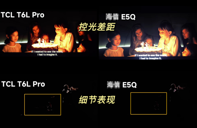 再接着看控光这块的差异更是让我惊呼差很大,明明接近的分区数,一边让光晕老实消失,一边却光晕泛滥。以前都说分区数越多画质越好,这次相似的分区数却有完全不一样的控光效果,估计不少人都看傻了眼。这也直白地道出了一个真理:背光分区不能只看数量!比如T6L Pro之所以没有光晕,核心就是因为采用了控光效果是普通分区数倍的万象分区技术,由于对成像全链路7大技术做了升级,420个万象分区才能迸发出远超800级普通分区的画质效果,没有光晕的画面,自然更加清晰有层次感。