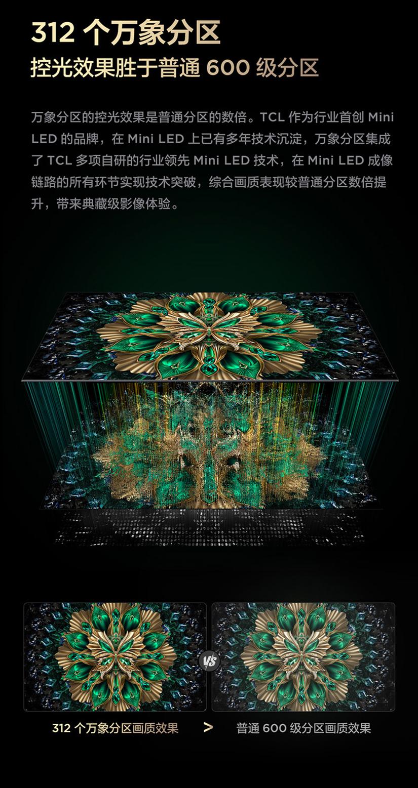 背光分区的数量已经被内卷的行业推到一个高不可攀的地步,但仅是数值的上涨而不作技术的迭代,都只是一句空泛的口号。TCL用成熟的“万象分区”技术打破规则,实现一区顶多区,通过各项技术层层优化,实际控光效果超过市面上普通的万级分区电视。