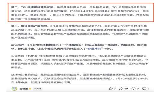 现在的消费者买东西还都喜欢看销量,毕竟销量好代表着产品靠谱,而TCL无论是从技术还是销量来看,都是妥妥的国内天花板,例如今年5月单月出货量夺冠,1-4月累计出货量近260万台,同比增长20.2%,稳居行业第一。结合5月表现,上半年冠军基本锁定,全年夺冠也很有希望!建议各位赶紧抓住国补的福利,想换电视不妨看看TCL T6L Pro,它是家庭娱乐的理想选择!