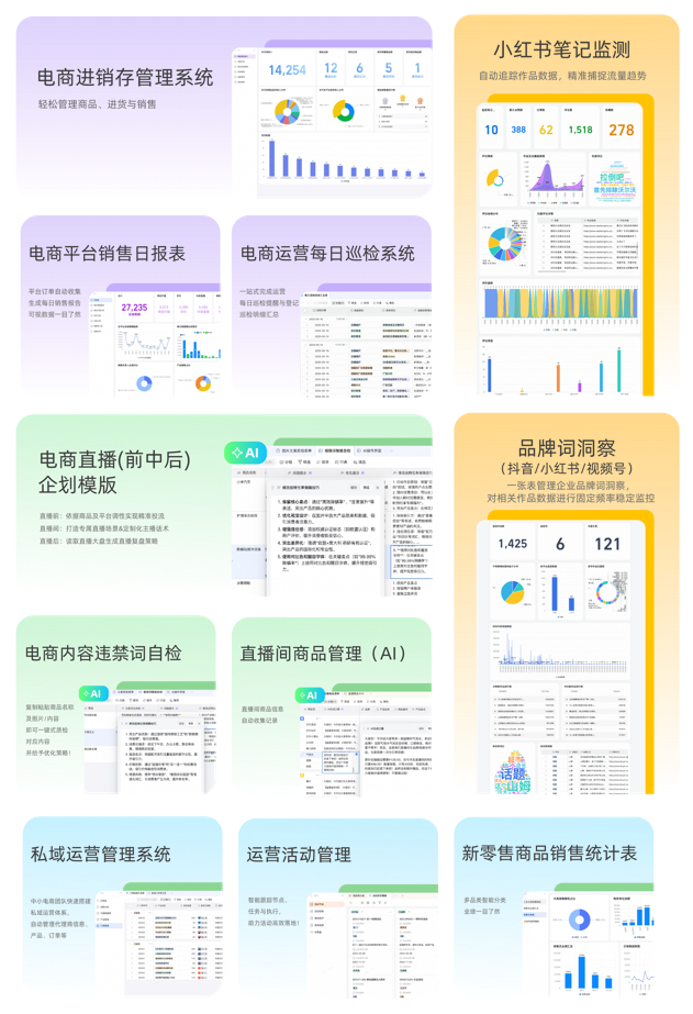 针对电商行业用户对多维表的高频需求,钉钉基于与企业的共创,推出面向电商行业的实用模板。现在,企业或用户在多维表模板中心可直接免费启用这些模板,超出免费用量后可单独增购。用一张表可以管理库存、直播间商品,或跨平台多店铺的商品评价、利润管理、销售报表等,完成电商运营与经营的通盘管理。