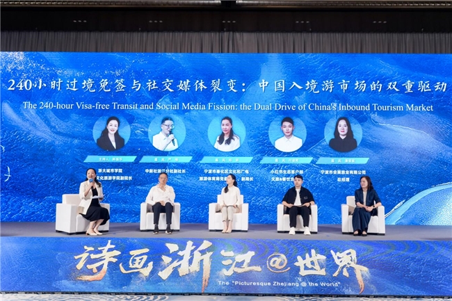 随后,浙大城市学院国际文化旅游学院副院长韩振华,中新社浙江分社副社长严格,宁波市奉化区文化和广电旅游体育局党委委员、副局长郑妍,小红书生态客户部文旅、餐饮负责人付俊曦,宁波市会展旅业有限公司总经理潘慧敏就《240小时过境免签政策与社交媒体裂变:中国入境游市场的双重驱动》主题展开圆桌对话。
