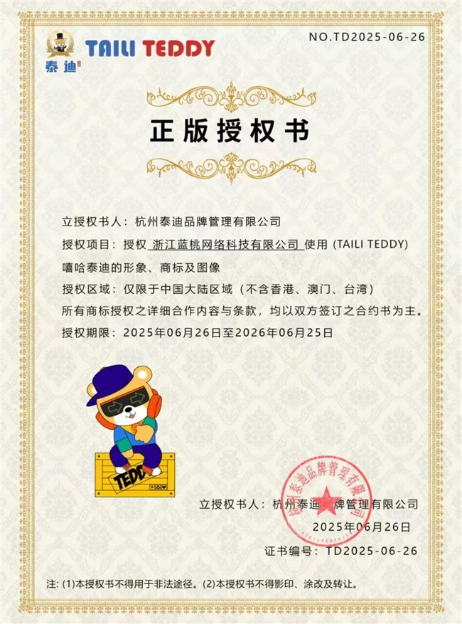泰迪熊正式授权泡泡星链使用其标志性的(TAILI TEDDY)嘻哈泰迪形象、商标及图像,这一举措无疑为双方的合作增添了更多的看点和想象空间。