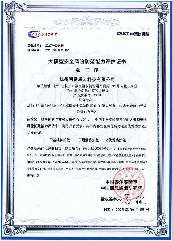 面对上述问题,目前大多数企业的解决方案是在大模型外添加一层审核机制,对大模型服务的输入和输出内容进行安全审核,大模型安全审核服务的能力直接关乎大模型服务的安全性和可靠性。基于此,中国信息通信研究院启动了2025年第一批可信AI(安全)-大模型安全风险防范能力评估工作。杭州网易质云科技有限公司(以下简称“网易易盾”)的“商和大模型-V1.0”顺利通过「大模型安全风险防范能力 第3部分:内容安全的评估」,获评优秀防护级(最高级),成为数字内容风控行业里首位通过该评测的服务商,彰显了行业领先地位与硬核实力!