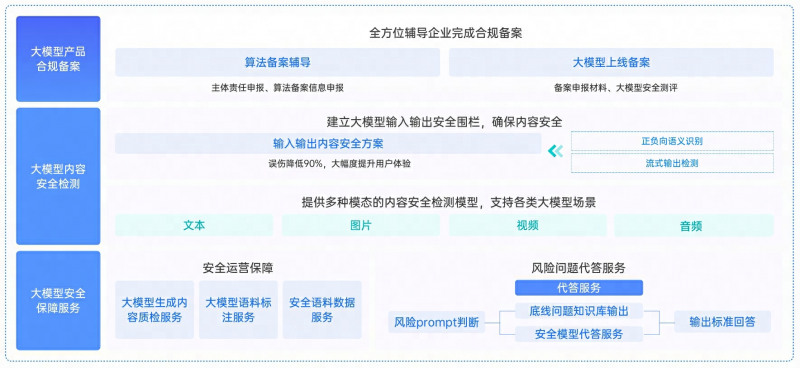 贯穿产品上线与运营全程,产品上线时提供安全咨询与功能服务,如算法备案、智能验证、大模型备案、实名核验、安全标准制定、内容标识、投诉举报等;