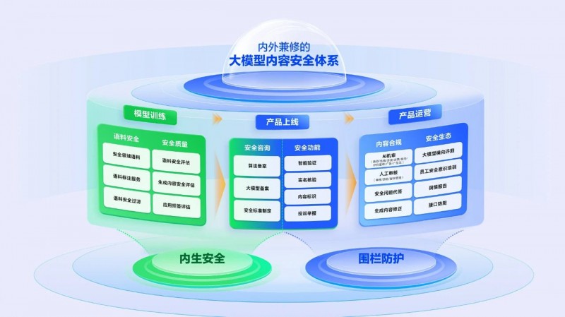 产品运营时确保内容合规,开展大模型横向评测、人工审核、安全问题代答等工作。同时构建安全生态,进行员工安全意识培训、舆情报告与接口防爬,二者结合全方位保障大模型内容安全。