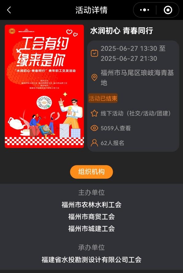 6月27日下午,由福州市农林水利工会、商贸工会、城建工会联合主办,福建省水投勘测设计有限公司工会承办的“工会有约 缘来是你”——“水润初心·青春同行”青年职工交友活动在马尾琅岐海青基地举行。
