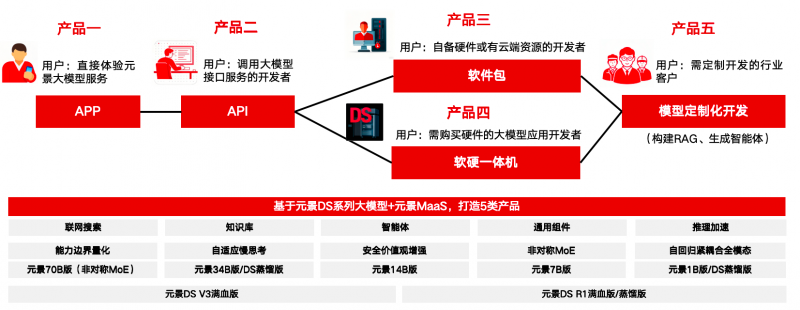 联通数智公司深度融合 Deepseek 技术,对标行业领先实践,基于元景大模型与MaaS 平台的技术底座,打造APP版、API 接口服务、软件包解决方案、软硬一体终端、模型定制开发服务五大产品形态。该产品矩阵针对不同行业客户需求与应用场景,提供模块化、高适配性的AI解决方案,有效助力各领域智能化转型进程。同时,依托持续的模型优化与创新迭代,形成“技术适配-场景落地-产品升级”的正向循环,构建差异化竞争优势。