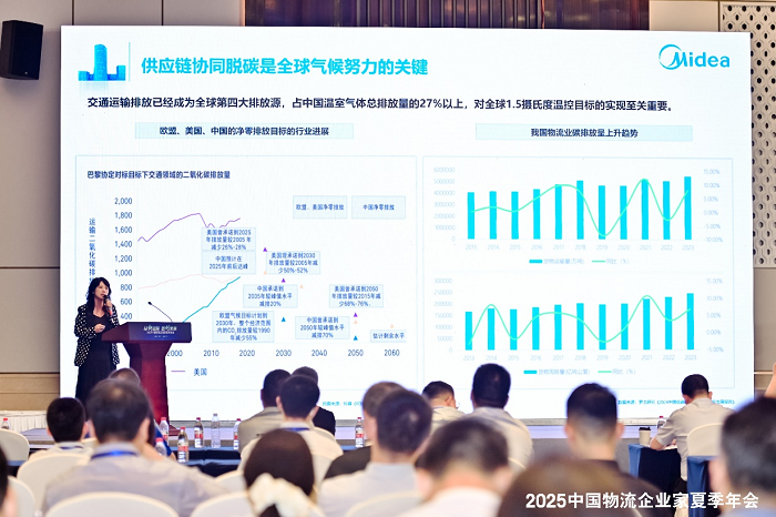 安得智联政企合作负责人、首席ESG专家田琳受邀参会,发表了题为《绿色供应链管理——从理念到实践的创新之路》的主题演讲。在演讲中,田琳深入剖析了当前全球气候变化形势的严峻性,指出交通运输排放已成为全球第四大排放源,占中国温室气体总排放量的27%以上,对全球1.5摄氏度温控目标的实现至关重要。她强调,供应链协同脱碳是全球应对气候变化的关键举措,需要上下游企业一致行动,共同推进全价值链的脱碳进程。