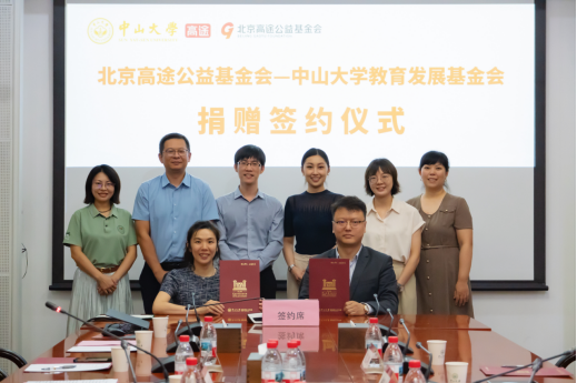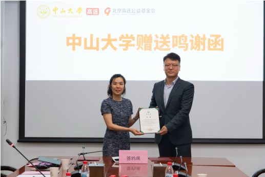 (黄瑞敏秘书长代表中山大学教育发展基金会向北京高途公益基金会颁发鸣谢函)
