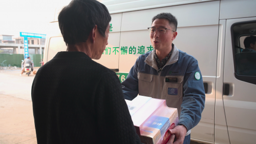 图为送货员使用“无感签收”记录仪进行送货