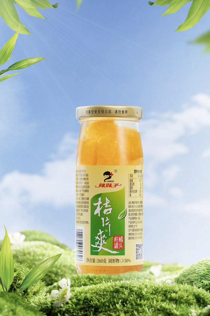 辣妹子的桔子罐头,精选了湖南常德、湖北、福建等各地优质蜜桔为原料。这些桔子在阳光充足的自然环境中生长,吸收了充足的养分,个大饱满,皮薄肉嫩,清甜多汁。在制作过程中,辣妹子遵循严格的质量标准和制作工艺,确保每一罐桔子罐头都保留了桔子的鲜美口感和天然营养。其核心单品——桔片爽,不仅味道甜爽,而且色泽鲜艳,深受消费者的喜爱。畅销27年,经典依旧,是许多湖南人记忆中的味道,无论是家庭日常食用,还是作为礼品馈赠亲朋好友,都成为首选。