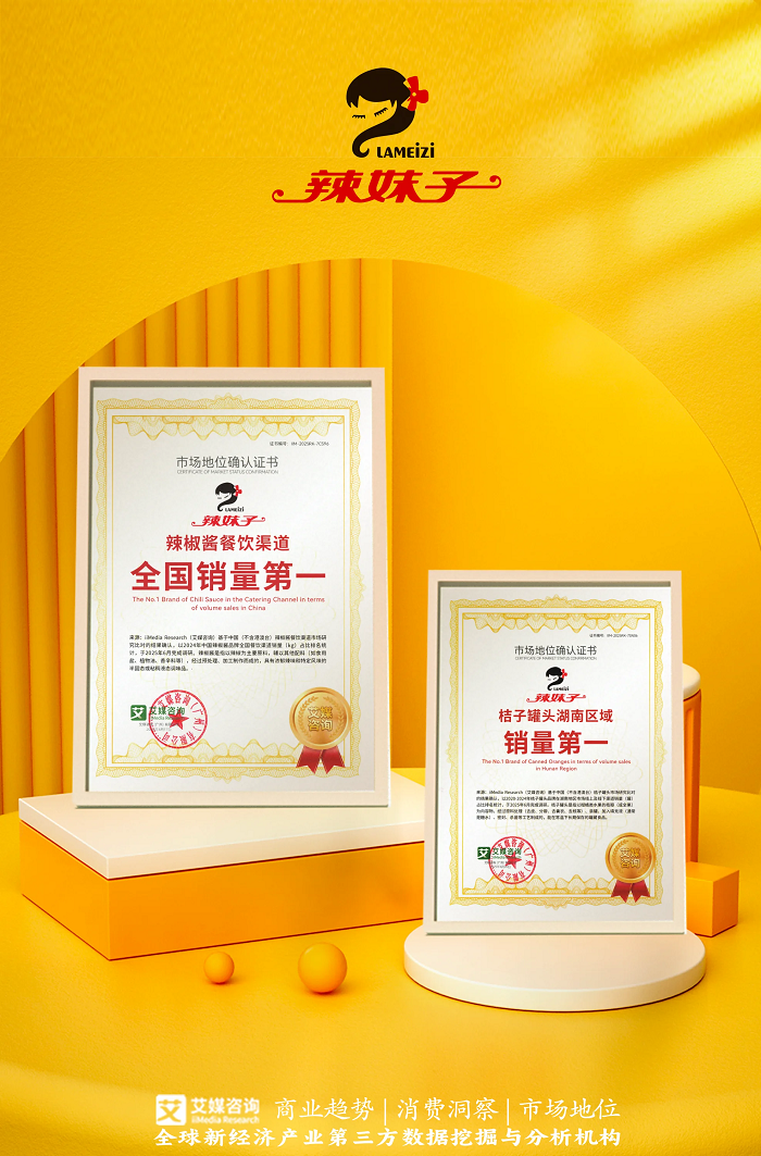 近期,辣妹子获全球领先的新经济产业第三方数据挖掘和分析机构iiMedia Research(艾媒咨询)授予的“桔子罐头湖南区域销量第一”“辣椒酱餐饮渠道全国销量第一”双项市场地位确认。